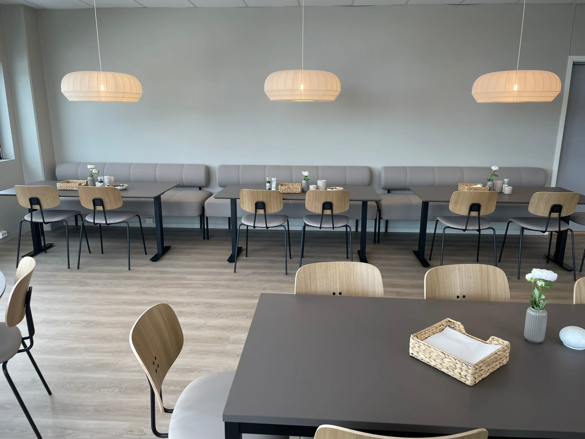 Vi tegnet og leverte nye møbler og lamper til kantinen, med fokus på smarte sitteplassløsninger som gir et trivelig og funksjonelt fellesområde.