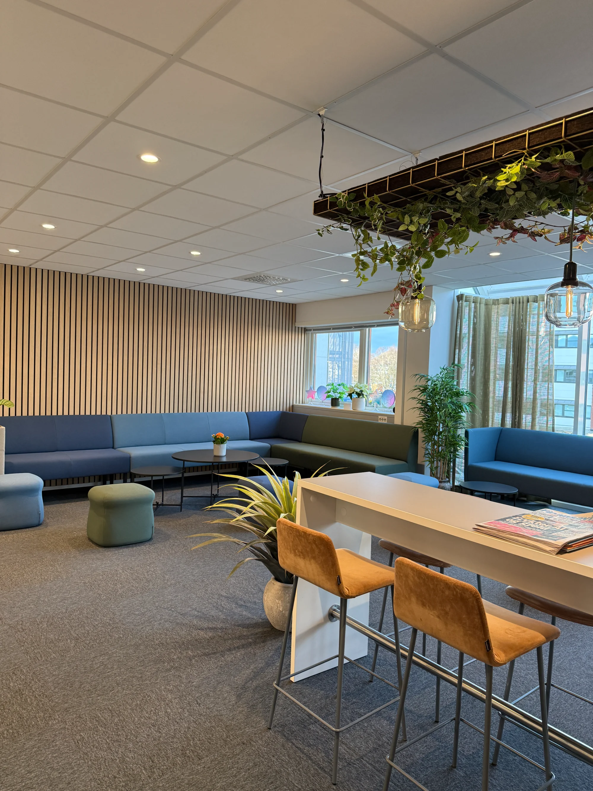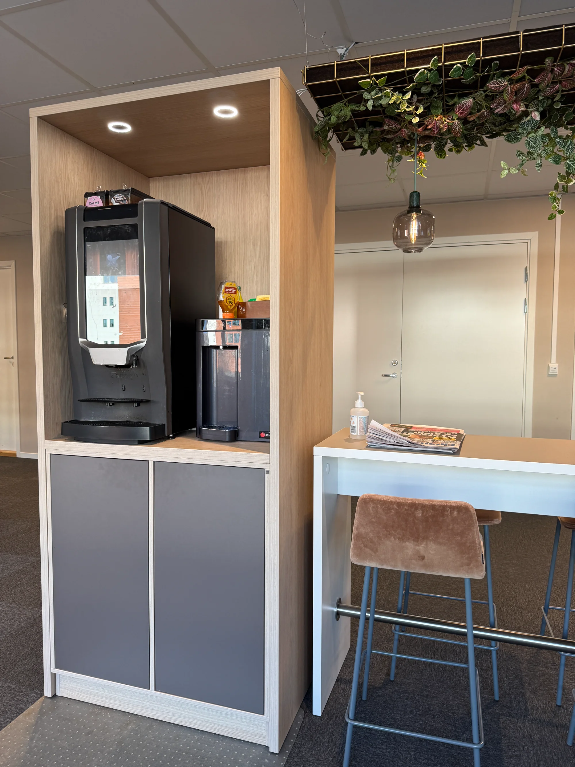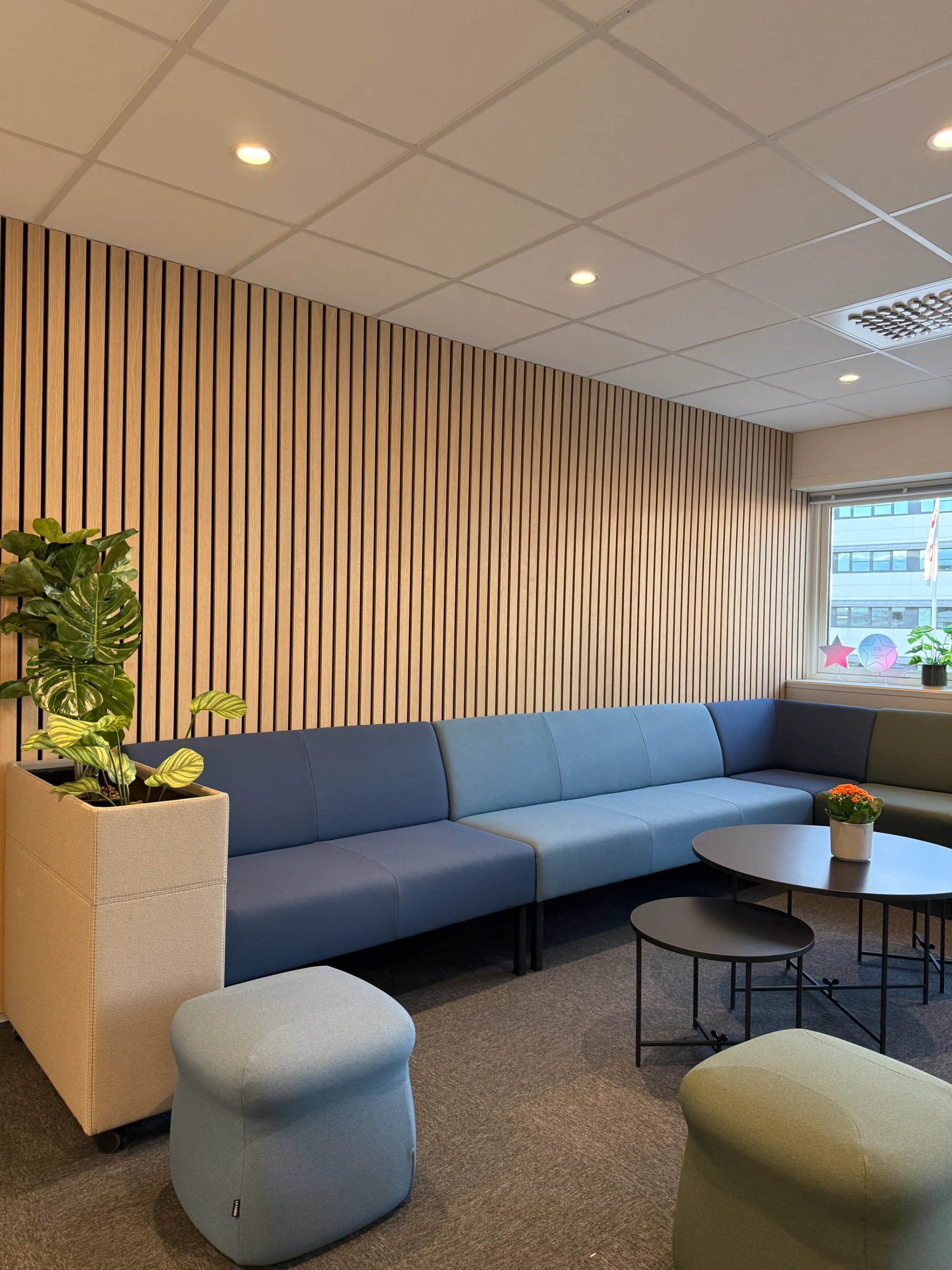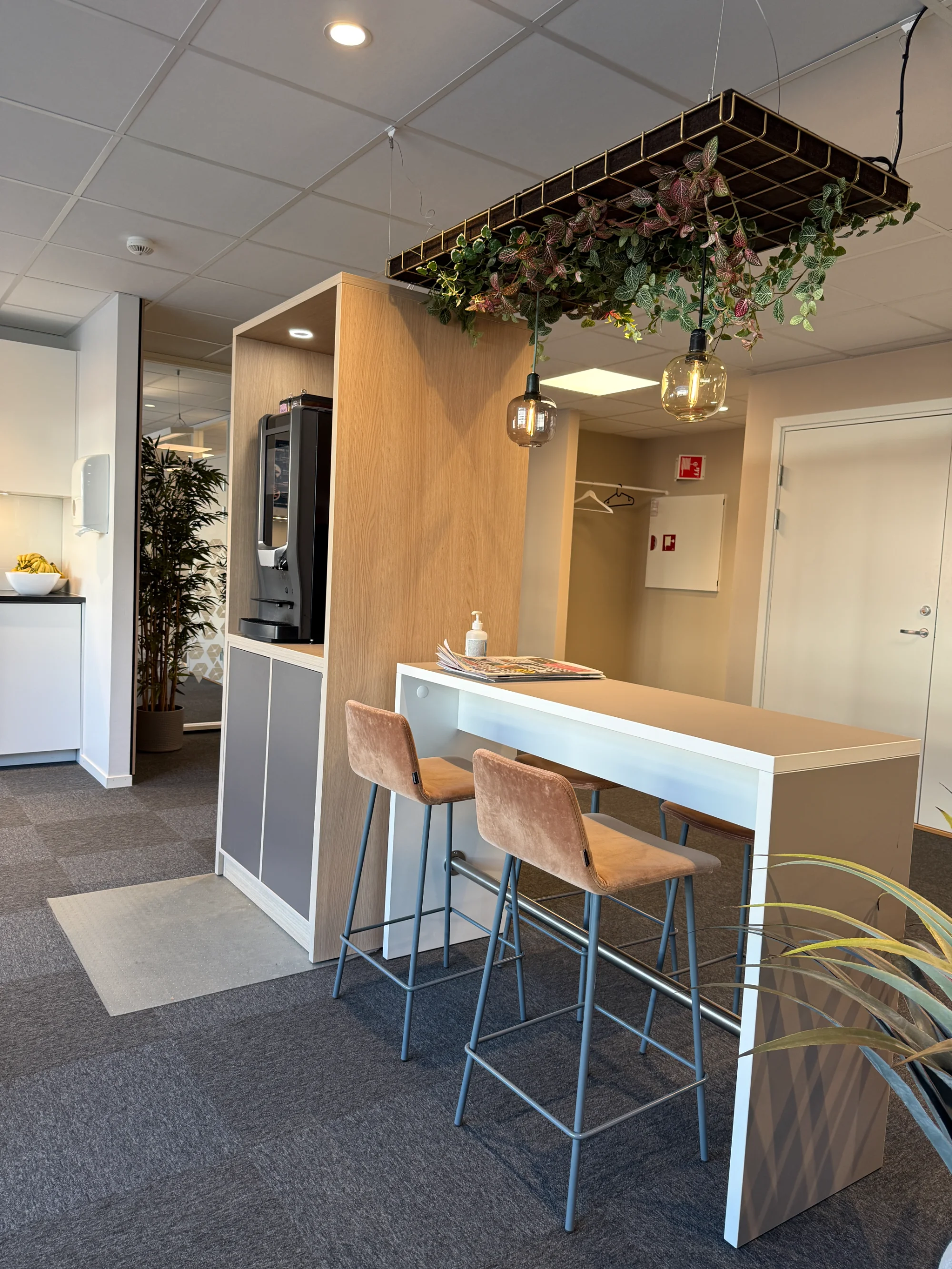 Gjennom rådgivning og design skapte vi en ny sosialsone med møbler som inviterer til både uformelle samtaler og kortere møter. Løsningen kombinerer funksjonalitet med et moderne uttrykk.